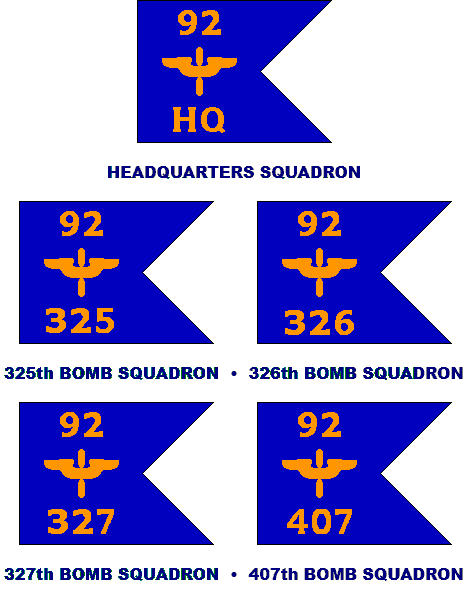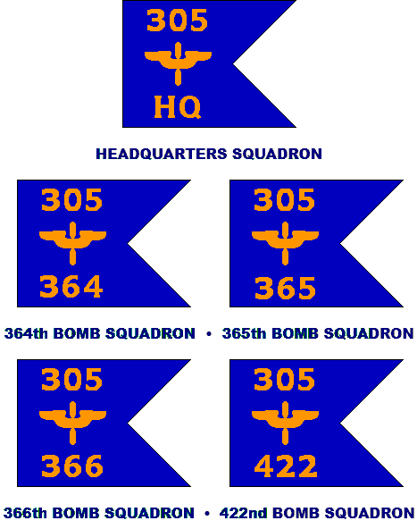 In June 1944 the Eighth Air Force's 40th Bomber Wing, 1st Bombardment Division, was headquartered at Thurleigh, Northhamptonshire. Of its three subordinate bombardment groups, the 92nd was based at,Podington in Bedforshire, the 305th was based at Chelbeston in Northhamptonshire and the 306th was collocated with the wing headquarters at Thurleigh. The groups each embodied a headquarters squadron, four bomb squadrons equipped with the B-17 Flying Fortress heavy bomber, and various service units.The group, usually composed of three or four squadrons, was the color-bearing echelon of the US Army Air Corps (USAAC). Organizational standards for groups were of the standard Army pattern for mounted and mechanized units, made of silk, 3 feet at the hoist by 4 feet on the fly, plus 2 1/2-inch fringe. The field of the standard was ultramarine blue and the fringe was golden orange. The standard was always carried or displayed with a National Standard of the same materials and dimensions. Squadrons of groups and separate squadrons had flags and guidons based on the colors ultramarine blue and golden orange, the Air Corps branch colors. Guidons were made of wool bunting, 20 inches at the hoist by 27 3/4 inches on the fly with a 10-inch fork. Guidons of squadrons assigned to groups had the group number above and the squadron number below the branch insignia.Service units assigned to groups that were not part of the USAAC had flags and guidons of the designs authorized for their parent branches. Click on the SERVICE UNITS link under each group to view these.Note: The enormous expansion of the USAAC during the war makes it doubtful that all groups received a coat of arms and a unique organizational standard. Shown below are the National and Organizational Standards of the 5th Bombardment Group, a prewar unit. Wartime units that did not receive a coat of arms may have had a standard with the eagle's breast feathered and a badge above its head, as authorized by AR 260-10 for color-bearing units with no coat of arms.Credits: The drawings on this page are based on the specifications given in Army Regulation 260-10 dated 25 October 1944, a copy of which was kindly provided by FOTW Mailing List member Joseph McMillan. Order of battle information was taken from Dr. Leo Niehorster’s outstanding and essential website, World War II Armed Forces: Orders of Battle and Organizations.