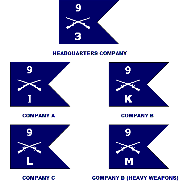 Infantry regiments of the US Army were organized with a regimental headquarters company, three infantry battalions, a regimental cannon company, a regimental antitank company, and a regimental service company (supply and transportation). Each battalion had a headquarters company, three rifle companies and a heavy weapons company. The cannon company had six towed M3 105mm light howitzers and the antitank company had nine towed 57mm antitank guns. The three battalion headquarters companies included an antitank platoon with three 57mm AT guns, for a regimental total of eighteen. Each battalion heavy weapons company had six 81mm mortars and eight caliber .30 machine guns. The rifle companies had a weapons platoon with three 60mm mortars and two caliber .30 machine guns.Guidons for infantry companies had a dark blue field with insignia, numbering, and lettering in white. For the regimental headquarters company, the regimental number was above and the monogram HQ was below the Infantry branch insignia, crossed muskets. Battalion headquarters companies had the battalion number below the branch insignia, the service company had the monogram S, and the rifle companies were lettered. Lettering was consecutive throughout the regiment: companies of the 1st Battalion were lettered A, B, C, D; those of the 2nd Battalion were lettered , E, F, G, H; and those of the 3 Battalion I, K, L, M—J being skipped. The regimental cannon and antitank companies had guidons displaying the branch insignia only.